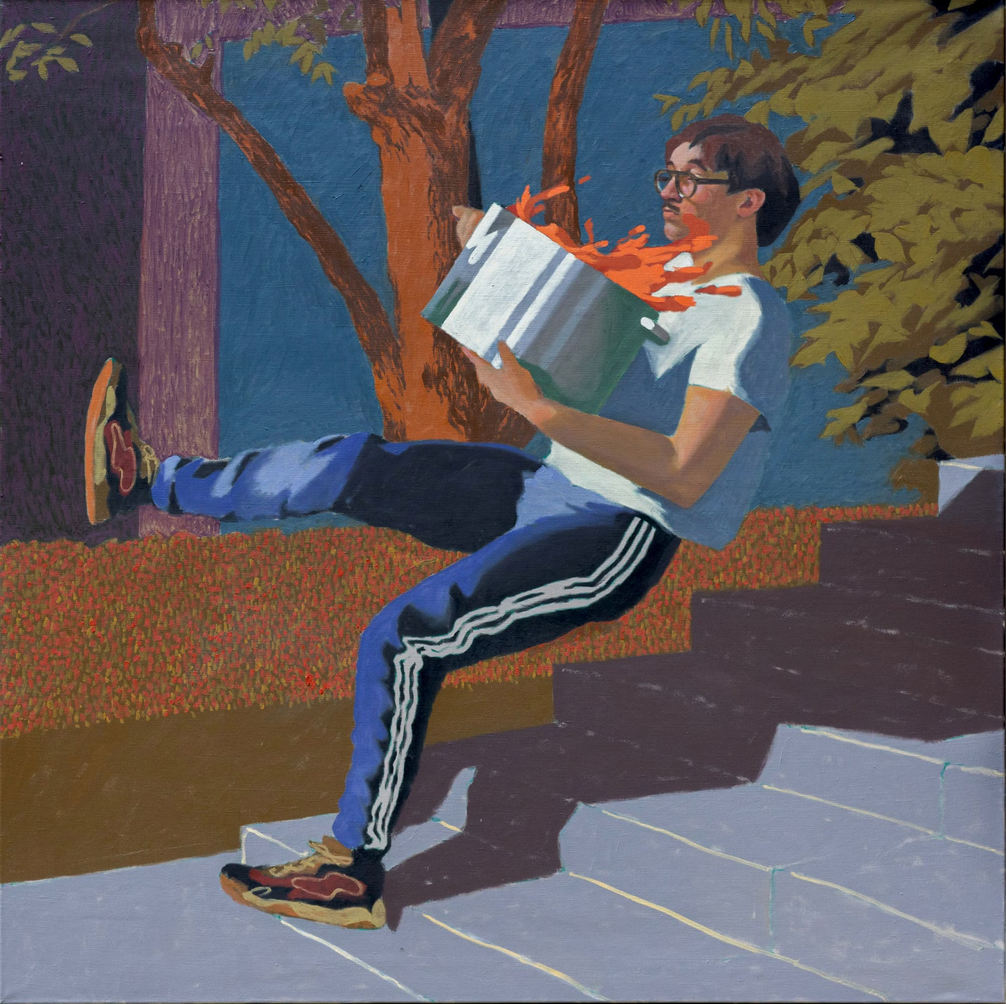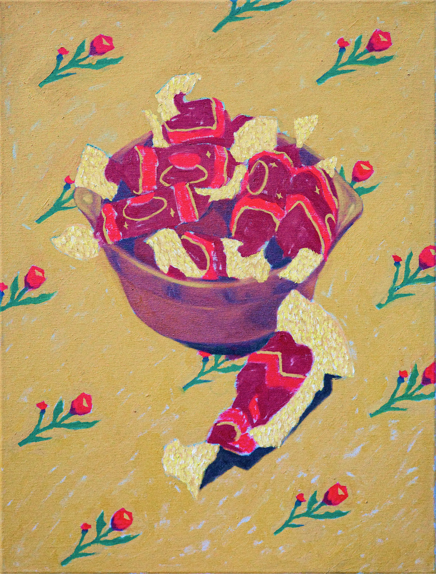 Obraz jest adaptacją słynnej sceny z The Office, w której Kevin wywala się ze swoim Chilli (S5E26), jednocześnie symbolem mojego bolesnego upadku w zabieganiu o względy innych. Przypomina mi o podstawowym kłamstwie terapeutów „Nie jesteś zupą pomidorową żeby cię wszyscy lubili”. Zgadzam się co do przekazu, nie ma co walczyć o sympatię każdej osoby w zasięgu wzroku, jedna z nich nie będzie cię lubiła z zasady. Chodzi o zupę pomidorową, nie wszyscy ją lubią. Jest dużo osób nie lubiących pomidorów, nic dziwnego bo przypłynęły do nas dopiero w XVI wieku z Meksyku. Ja na przykład, nie lubiłem zupy pomidorowej, teraz lubię. Obraz uzupełnia karton najlepszych pomidorów krojonych.
