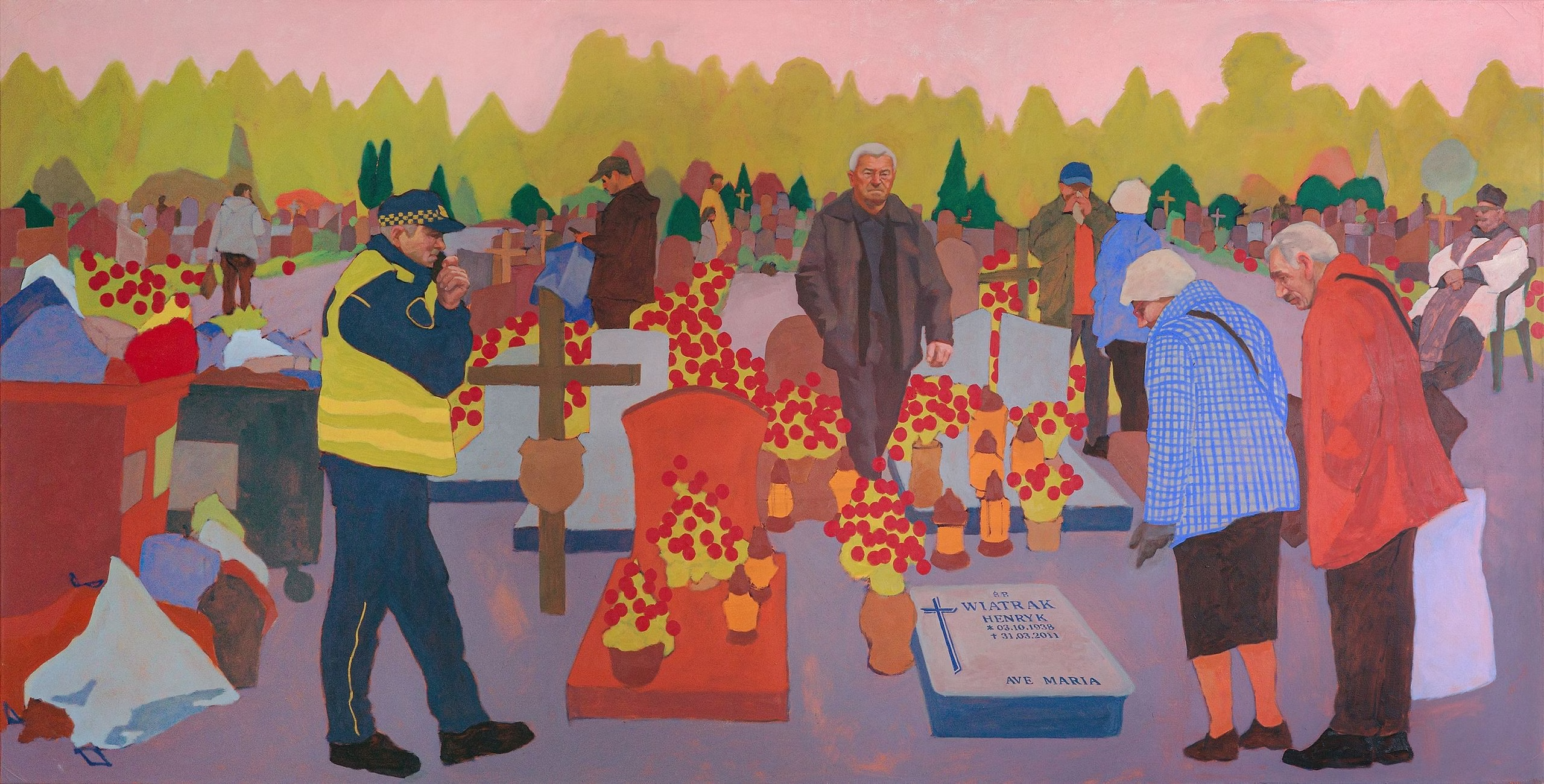 Obraz powstał na podstawie dokumentacji z 1. listopada 2023 roku, ze zdjęć wykonanych na cmentarzu grabiszyńskim, osobowickim i bartoszowickim. Jest kolażem wszystkiego co wtedy wpadło mi pod obiektyw, zapisem ludzi chodzących między grobami. Pejzaż jest reprezentacją dnia zmarłych, tuż przed „zgaszeniem światła” – tym spektaklem, z którego jest znany najbardziej. Groby wibrują kolorami kwiatów, śmietniki kolorami foliowych worków, roztacza się zapach świec i obwarzanków. Obrazowi towarzyszą znicze, zamieniające poranek w wieczór.