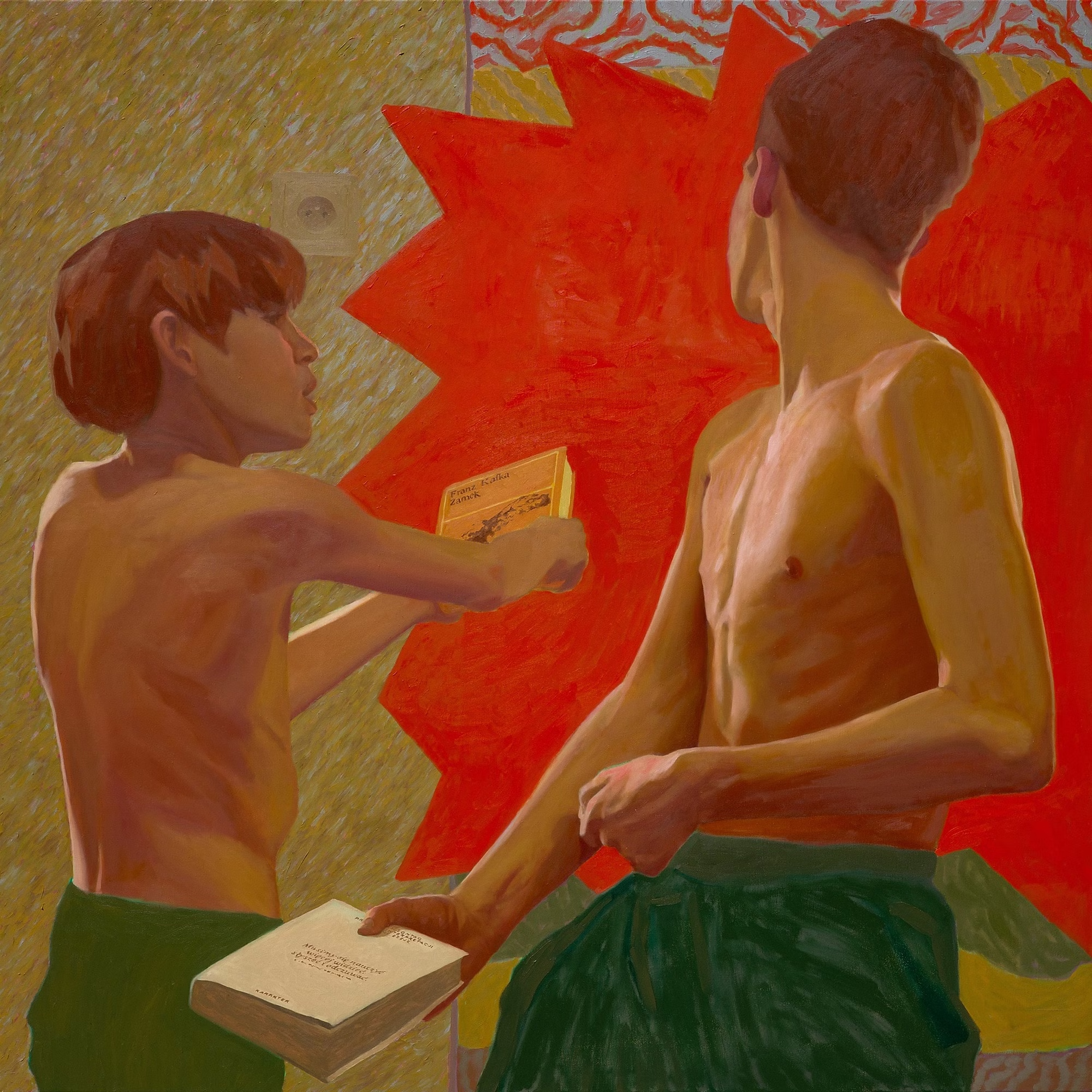 I have three brothers, I'm the eldest. There is a difference of three years between my youngest brothers (13 and 16), which is exactly the same as the difference between me and Filip, who is three years younger. Because of this strange coincidence, I sometimes have a sense of déjà vu as I watch my own memories unfold in front of my eyes. The painting is about competition, fighting for attention, losing, pain and reading. For in order to learn to see, hear and feel more, one must first fight one's brother at least once.